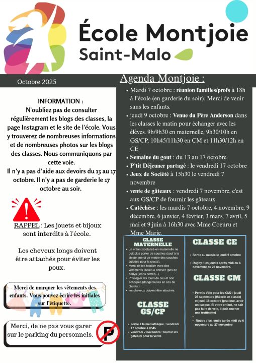 Ecole Primaire Privée Montjoie Classe de CE1, CE2 - Benoit Mexmain, Laetitia Simonnot - 2025/2026 Classe de CM1, CM2 - Violaine Ruellan, Adeline Brunet Echivard - 2025/2026 Classe de GS, CP - Pauline Perrin - 2025/2026 Classe de TPS, PS, MS - Isabelle MARO, Adeline Brunet Echivard - 2025/2026